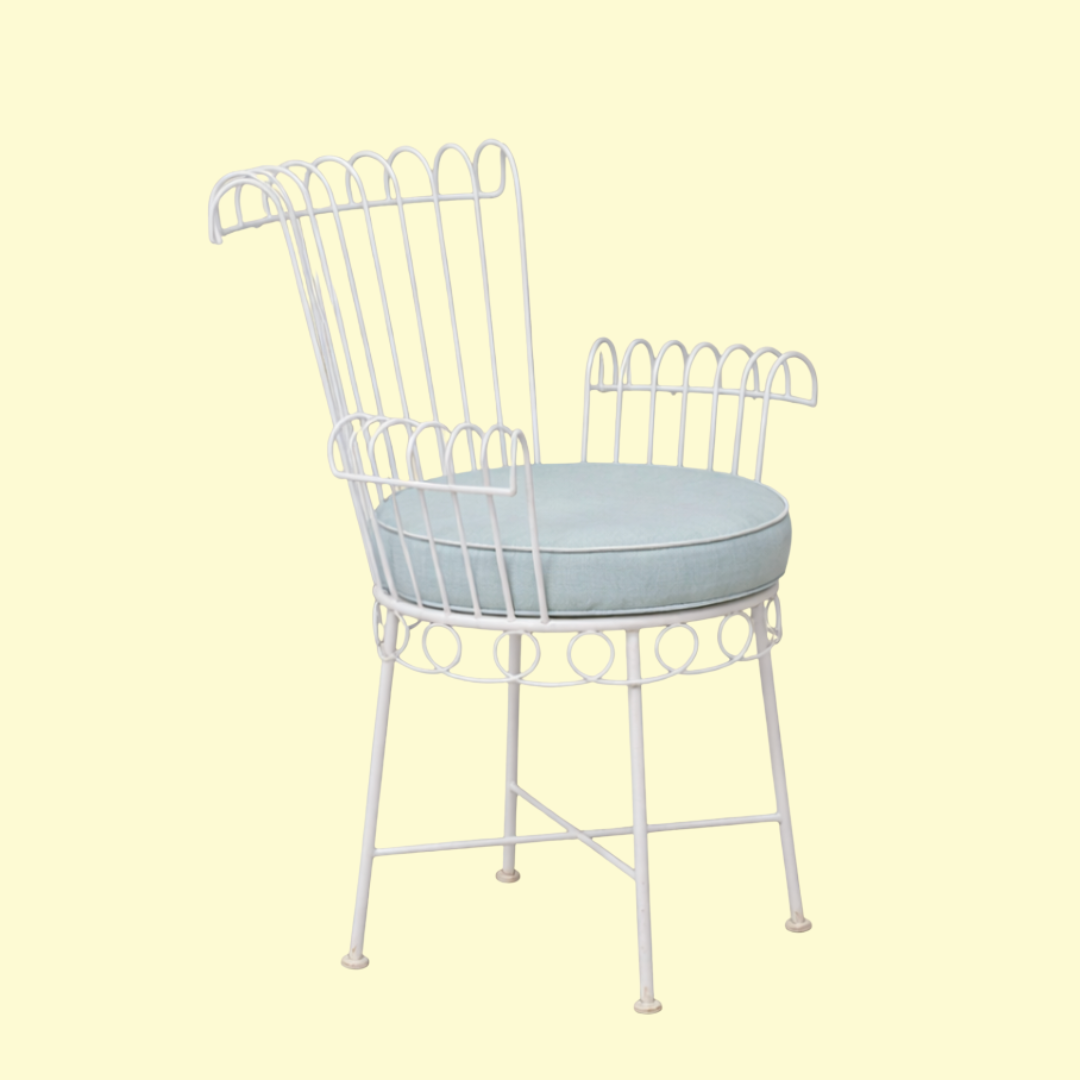 The Blue Lounge Moment is a three piece setting that comprises of two white garden chairs and one white outdoor day bed. The cushions are duck egg blue linen piped in ivory. The Blue Lounge Moment comfortably seats five guests and is accompanied by our matching white garden side table.