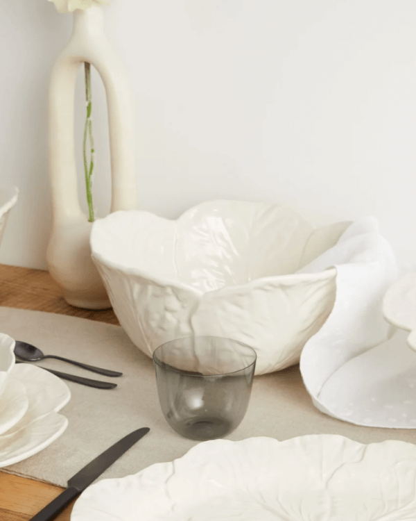 Bordallo Pinheiro's cabbage tableware was coveted throughout the twentieth century and this white salad bowl is a peaceful translation of original pieces. 2 available - hired only as a set with all other platters.
